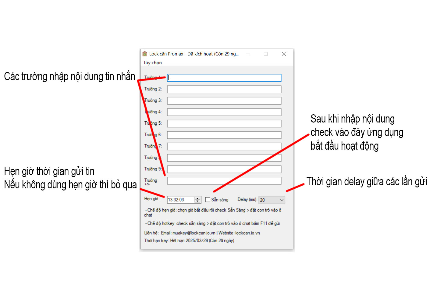 Chế độ hotkey (lock theo hiệu lệnh) phần mềm sẽ ngay lập tức gửi 10 tin sau khi bạn ấn F11